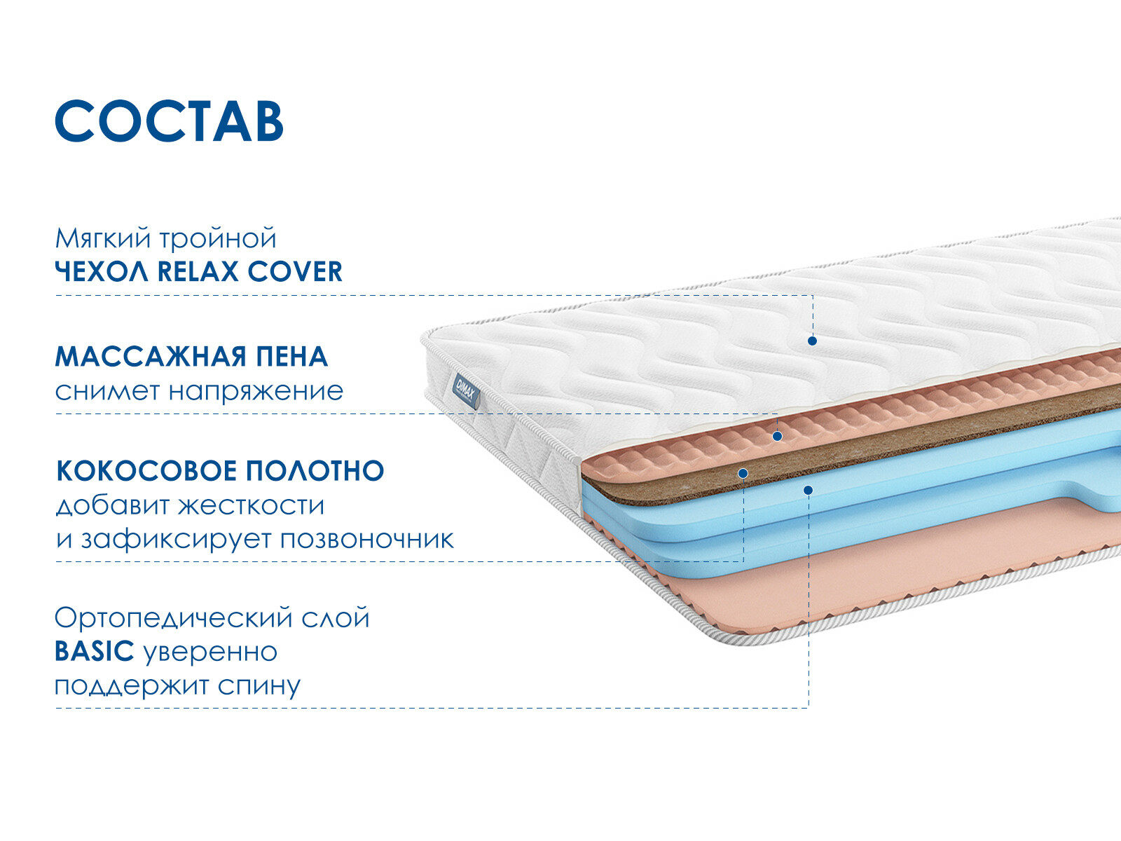 Невысокий беспружинный матрас Димакс Relmas Cocos Roll 9 сочетает массажный эффект с разной степенью жёсткости сторон. Компактный размер и ортопедические свойства делают его универсальным выбором для дома, дачи или временного проживания.