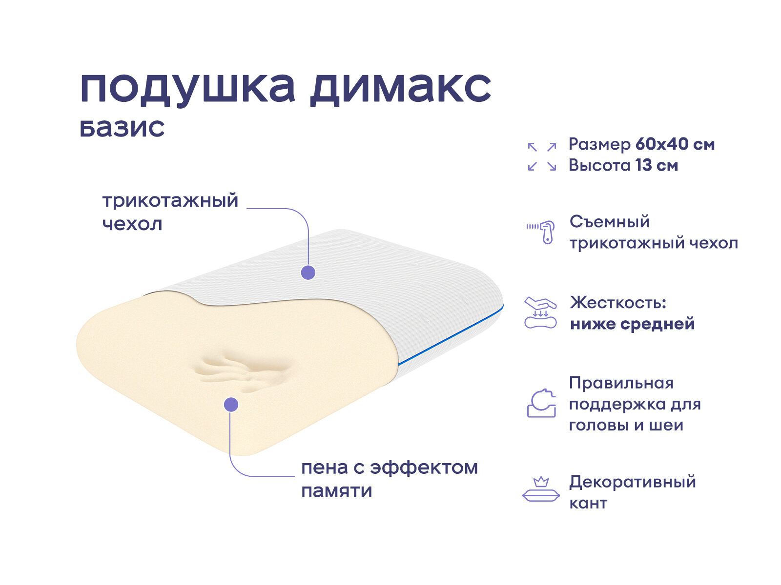 Мягкая анатомическая подушка классической формы. Модель универсальна и подойдёт для любой кровати и спальни. Наполнителем выступает инновационная пена мемори, которая запоминает линии тела. Это свойство позволяет подушке очень точно адаптироваться под любые особенности анатомии, делая сон комфортным. Модель бережно поддержит голову и шею в анатомически правильном положении. Подушка рассчитана на отдых в любой позе – сон на спине, животе или боку будет одинаково уютным.