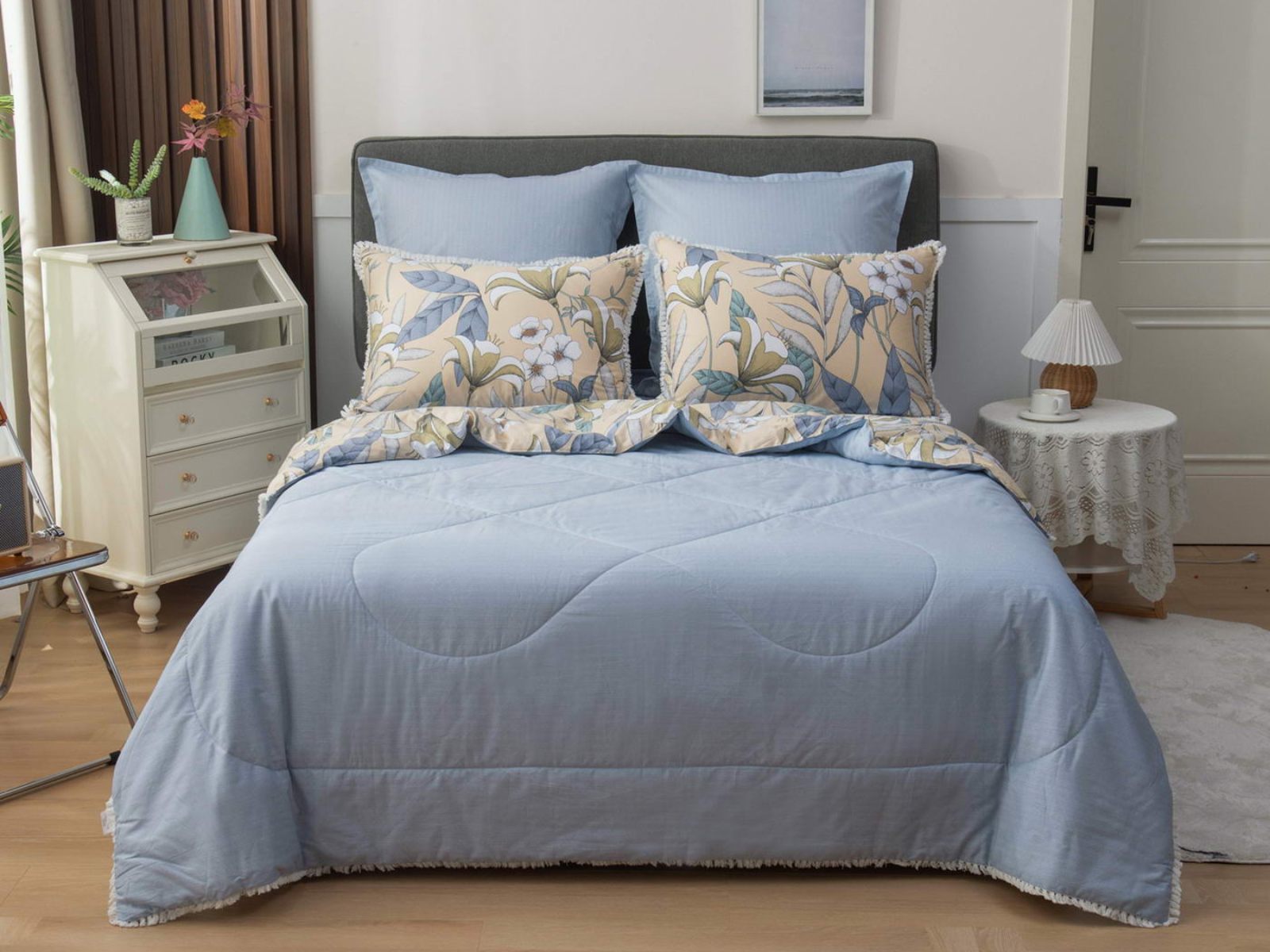 В комплекты комфортеров с одеялом Бернадетт входят наволочки, простыня и легкое всесезонное одеяло. Оцените это современное и очень удобное решение, которое идеально подходит тем, кто не любит возиться с пододеяльниками.