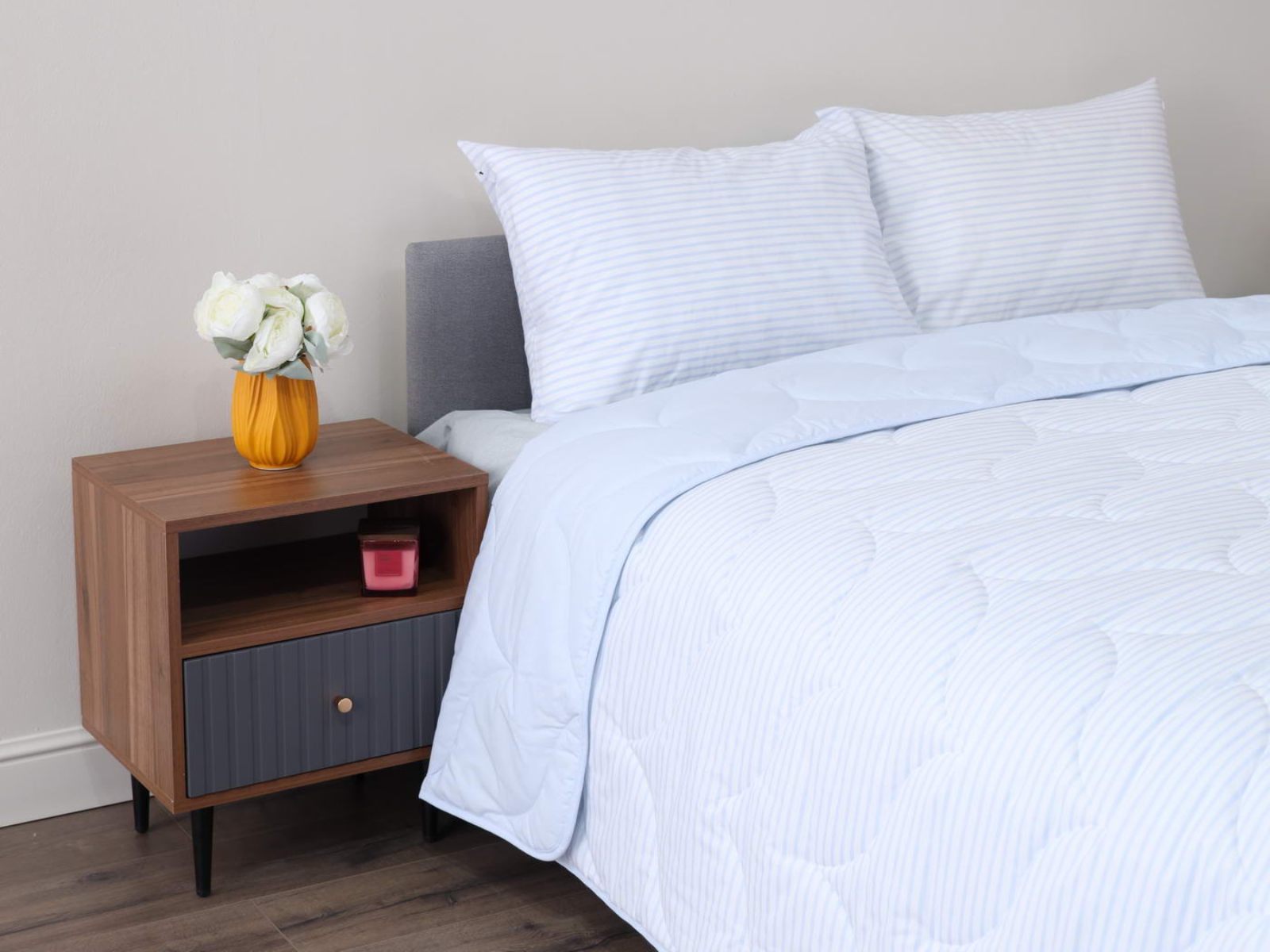 Комплект Мелвин легко стирается в обычной машине в бережном режиме и также легко гладится.