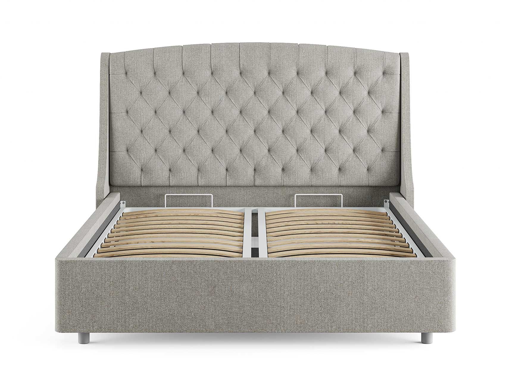 Кровать комплектуется металлическим основанием и подъемным механизмом со вместительным бельевым ящиком. Дно бельевого ящика легко сдвигается для обеспечения уборки под кроватью.