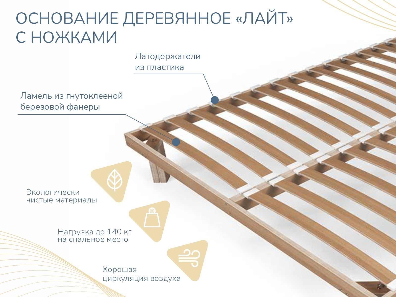 Деревянное основание на ножках для любых беспружинных матрасов и матрасов с пружинным блоком Bonnel и TFK. Рама изготовлена из клееной фанеры из березы сечением 50х25мм. Латы березовые, латодержатели пластиковые. Ножки прямоугольного сечения.